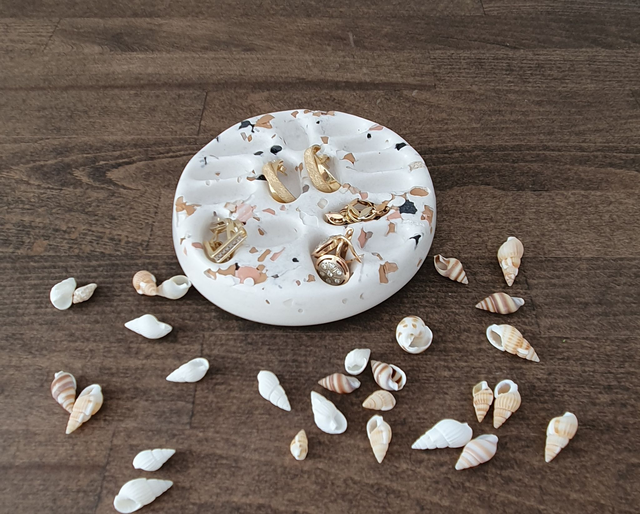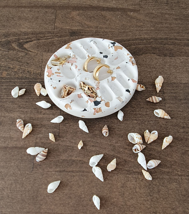Terrazzo gyűrűtartó minőségi Jesmonite kompozit anyagból kézzel készült, vízbázisú, környezetbarát, oldószer és VOC-mentes termék, nem tartalmaz toxikus anyagokat. Vízzáró réteggel kezelten kapod kézhez. A képen látható terméktől minimális eltérés lehetséges. Tisztítása puha, nedves ruhával ajánlott. Aranyfóliás, natúr, terrazzo, krém, kávé, homok változatban is elérhető! 11 x 2 x 11 cm